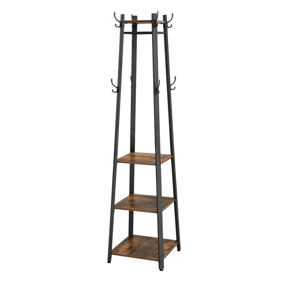 Perchero de Tres Niveles, Estilo Industrial, Color Marrón Rústico y Negro Acero, Duradero, Multifuncional, con Ganchos para Almacenamiento, para Sala de Estar