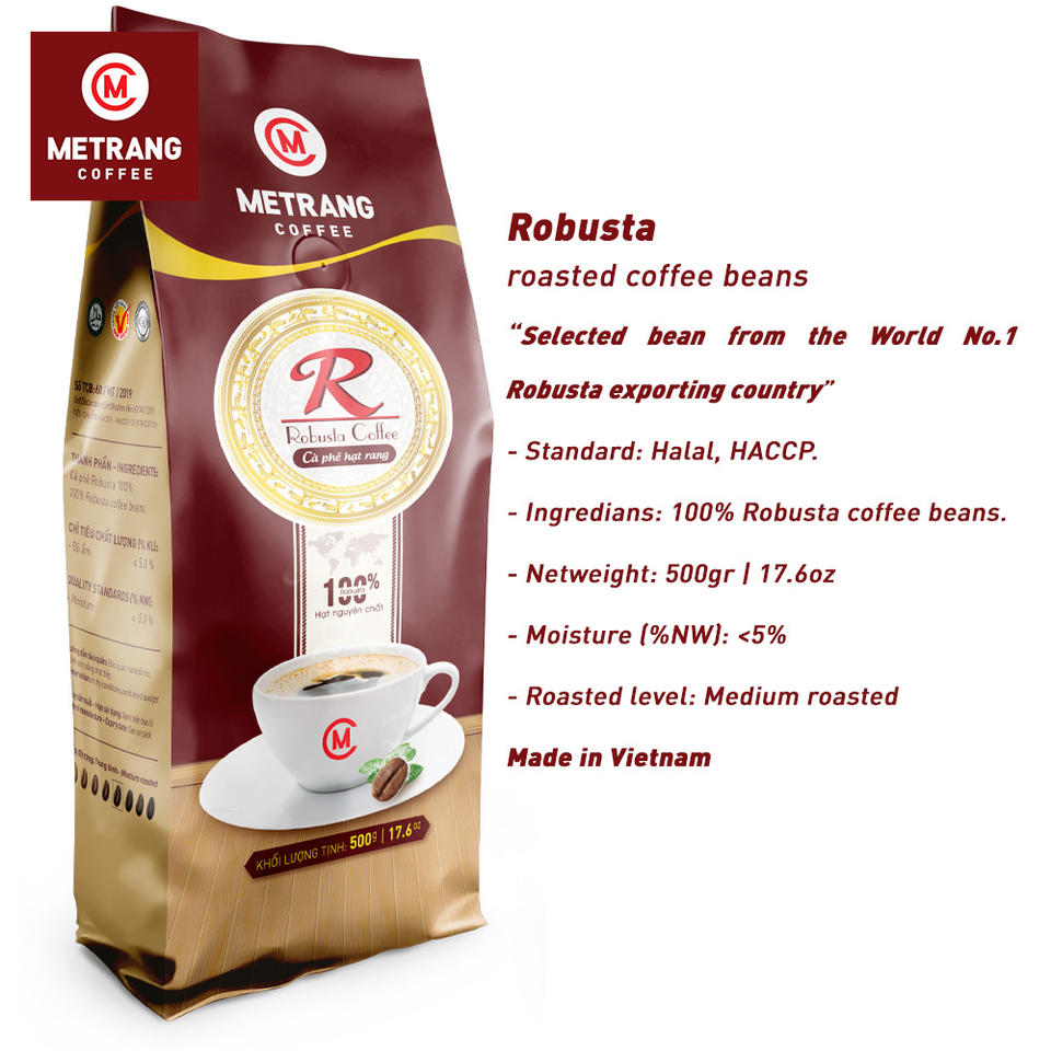 Granos de Café Producto Certificado HACCP HALAL 100% Granos de Café Robusta Vietnamita Tueste Medio Grado A Empaque de Bolsa de 0.5 kg Tostado