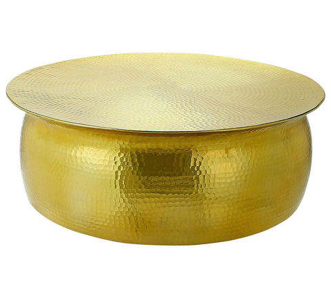 Mesa de centro redonda de alta calidad con superficie metálica chapada en oro y base con revestimiento negro. Mesas de centro y de café.