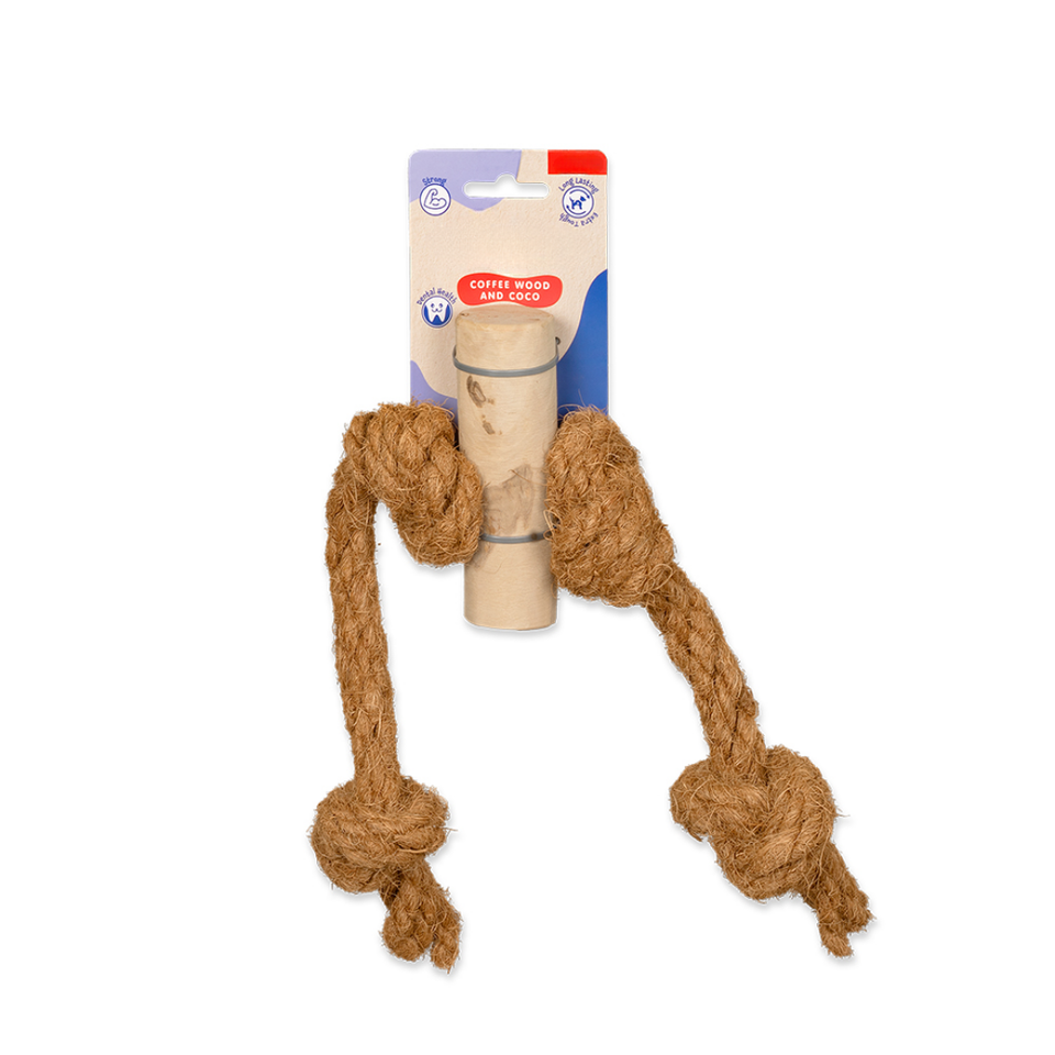 Juguete Masticable para Perro de Madera de Café y Cuerda de Coco Hecho con Materiales Sostenibles y Naturales