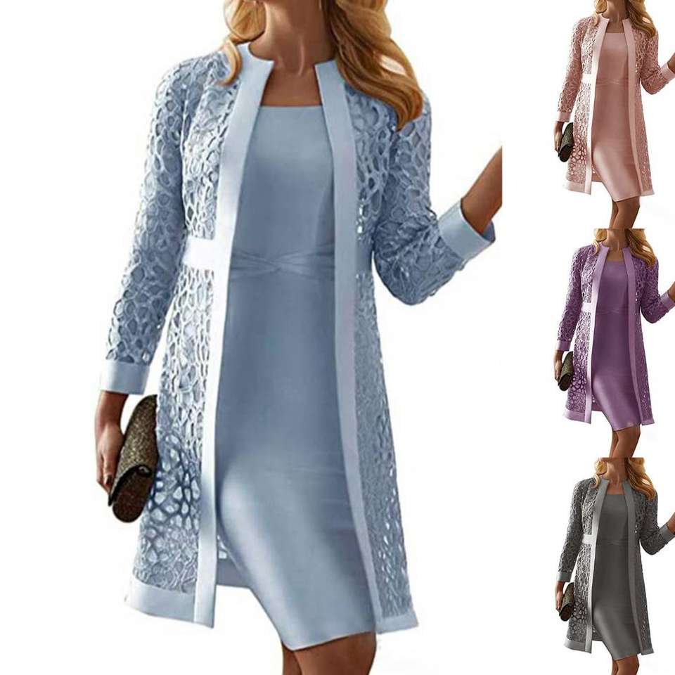 Vestido Casual para Mujer Col dker, Talla Grande, Color Sólido, Cárdigan de Encaje, Manga Larga, Hasta la Rodilla, Conjunto Elegante y Delgado, Vestidos de Quinceañera