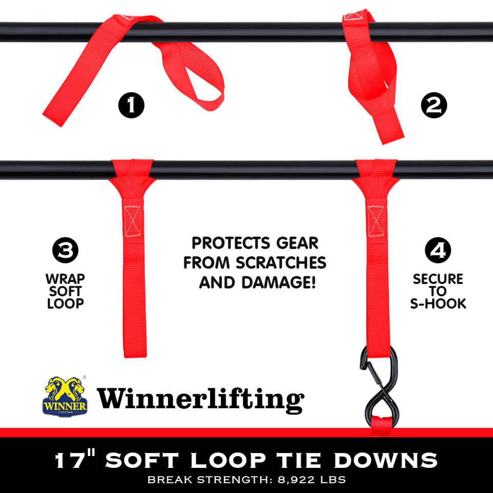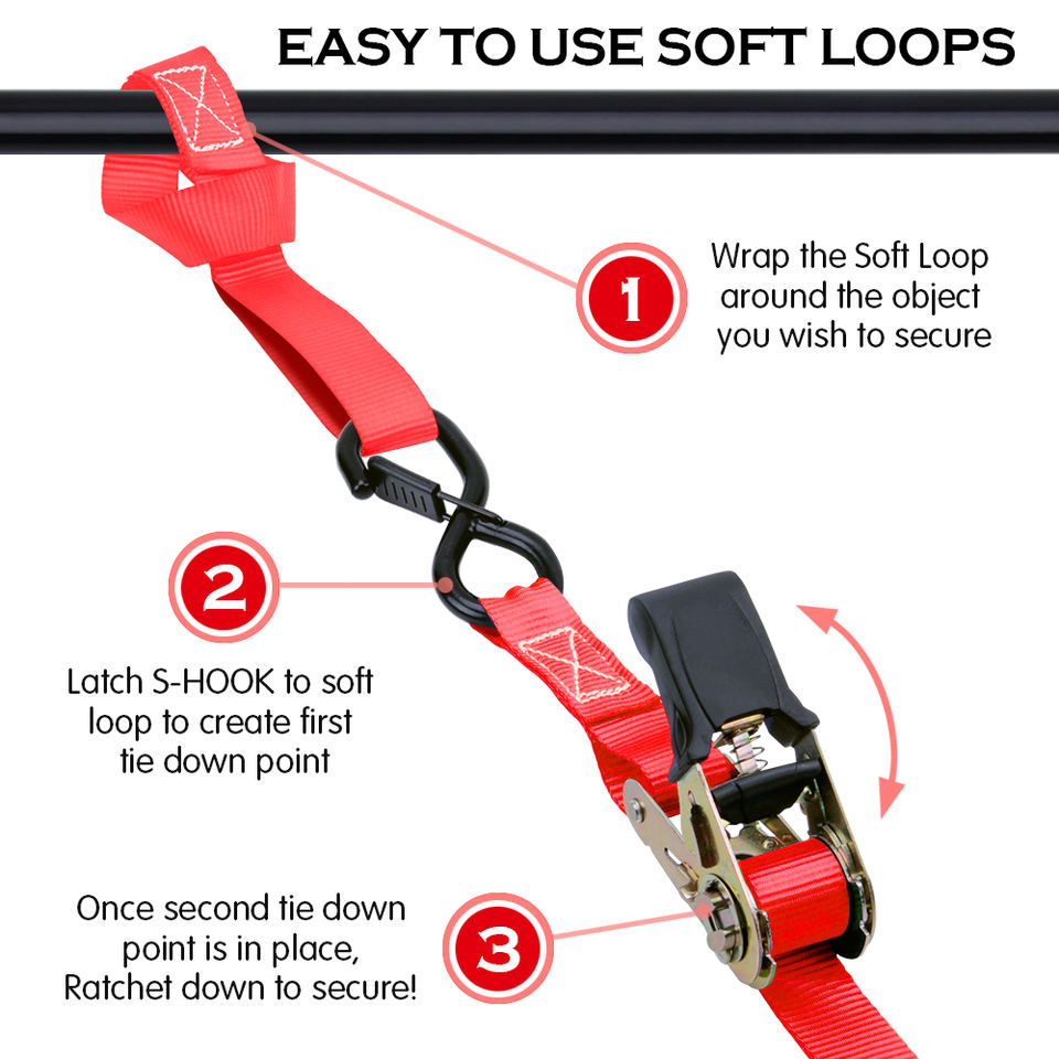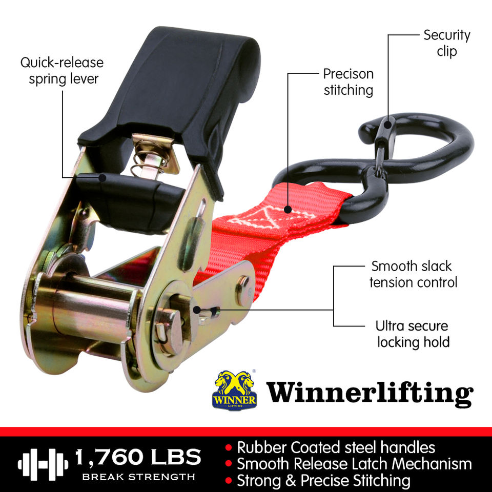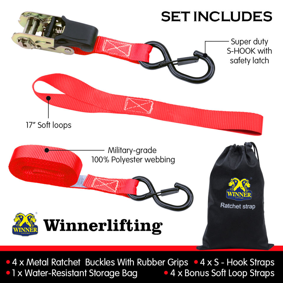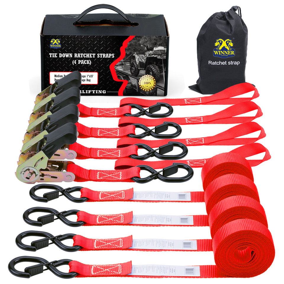 Juego de 4 Correas de Amarre con Gancho en S de 1 Pulgada, Color Rojo, en Caja de Color