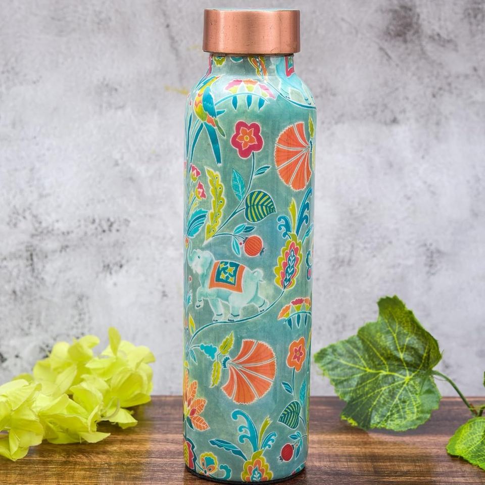 Botella de agua de cobre recubierta de esmalte de salpicaduras de color para beneficios de salud ayurvédicos a prueba de fugas diseño ecológico y duradero