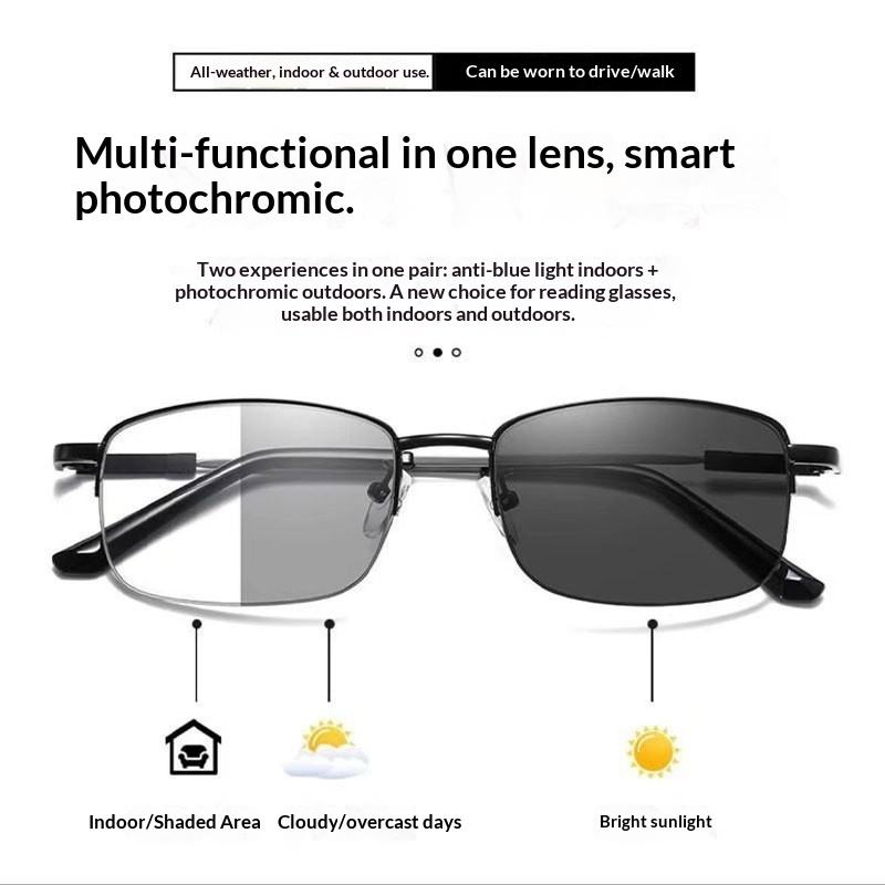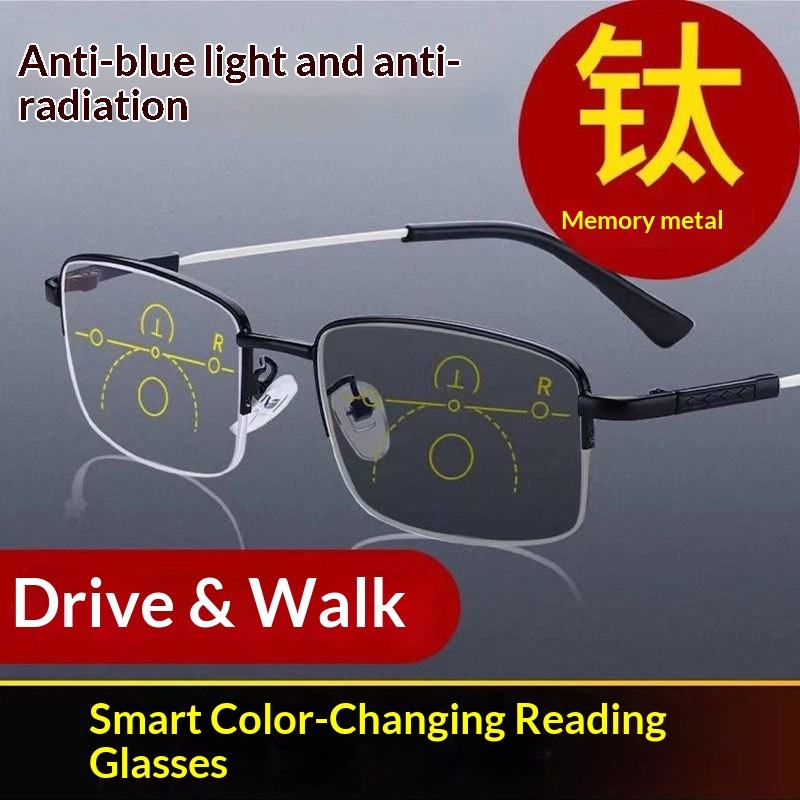 Color-changing Far Dual-Use Progressive Multifocal Smart Zoom Titanium Memory Anti-Blue Light UV400 Reading Glasses for Driving
