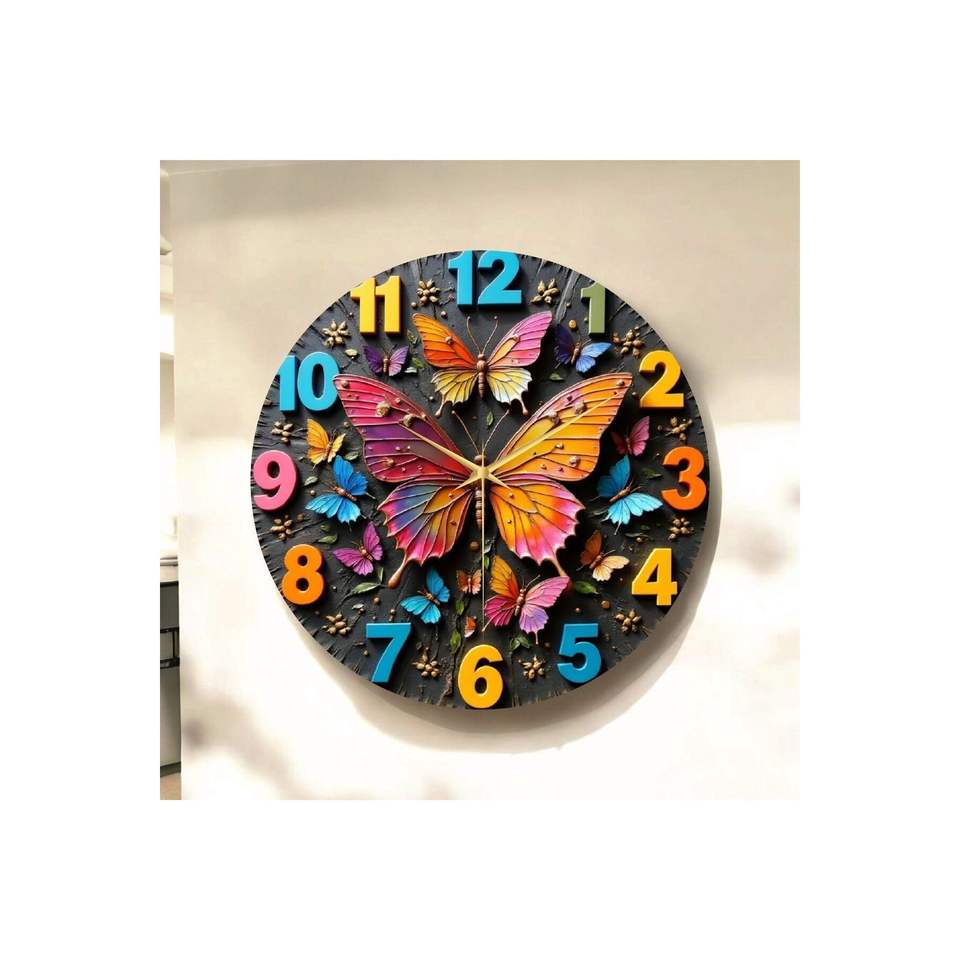 Reloj de Pared Redondo de Madera con Diseño de Mariposa Colorida, Estilo Clásico Silencioso, Origen TR, con Números, Regalo Único con Diseño Estampado, 45x45cm