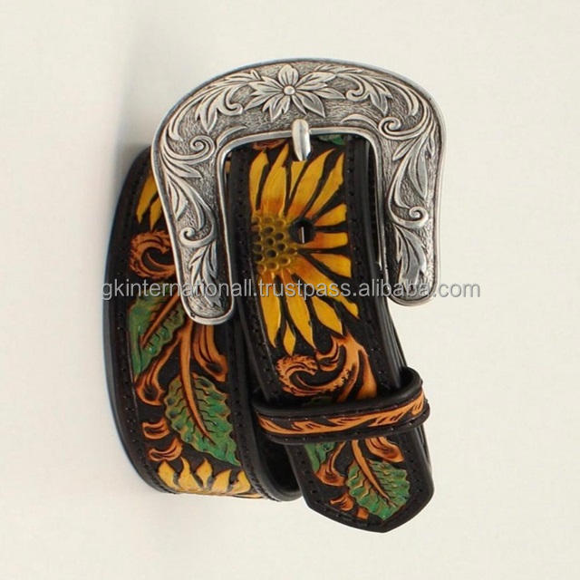 Cinturón de herramientas de cuero occidental con relieve floral tallado a mano colorido para hombres y mujeres con hebilla de aleación de diseñador Pin Zinc