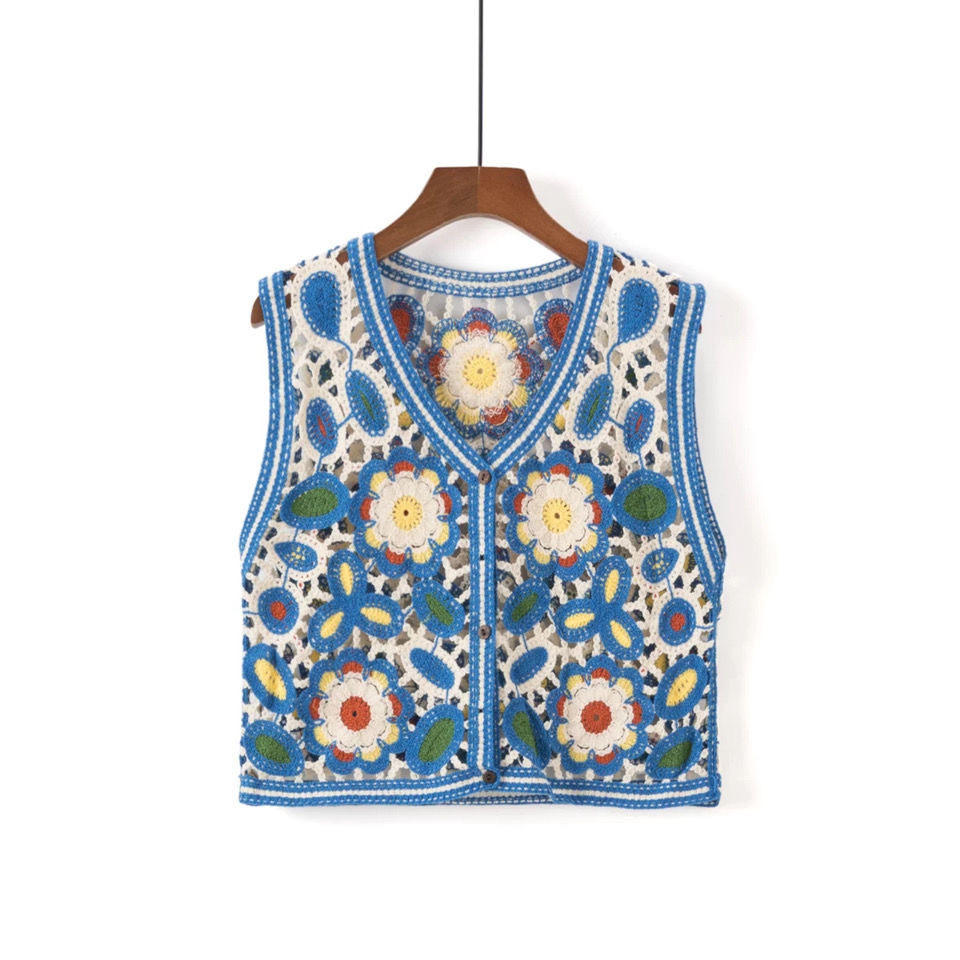 Colorido máquina de punto bordado calado de punto nuevo hueco sin mangas cuello en V bordado chaleco Top Chaleco de mujer