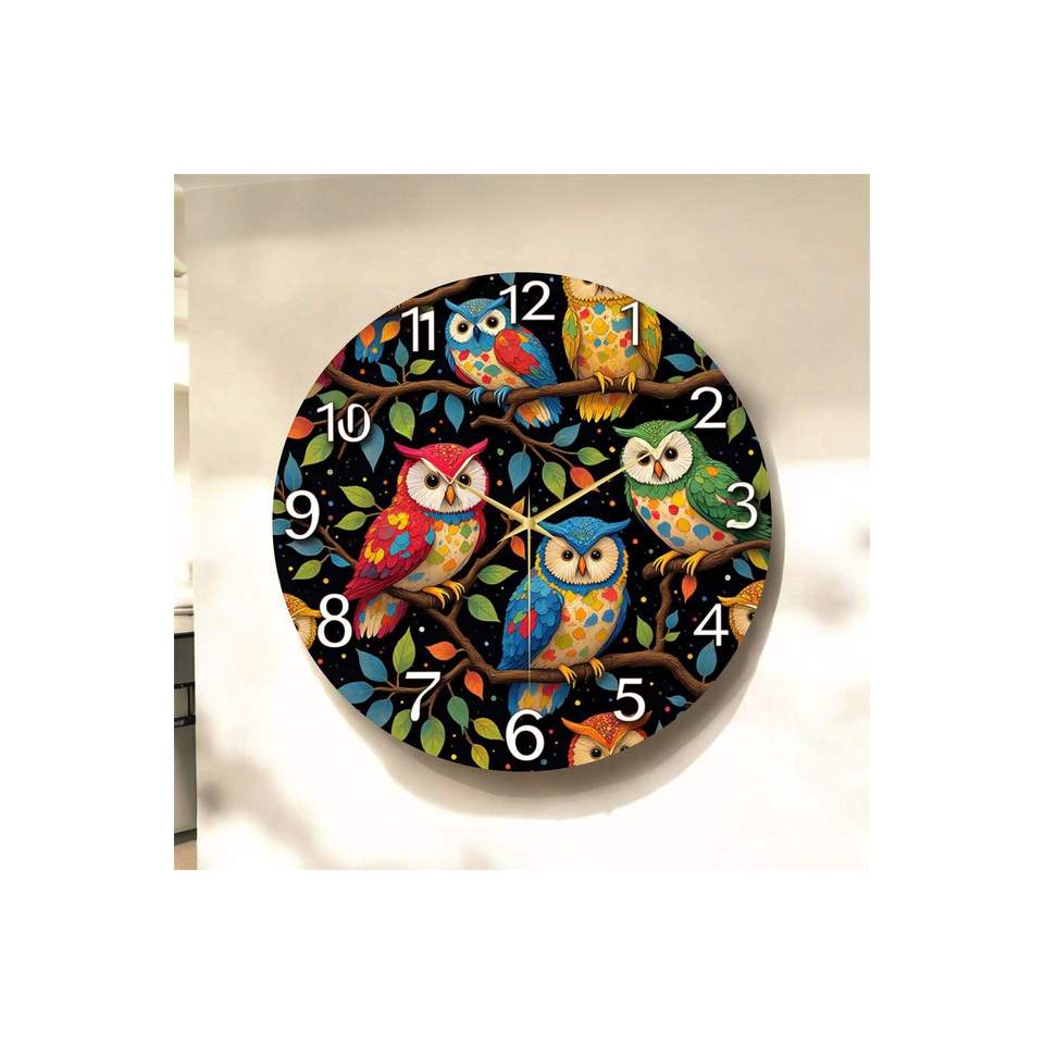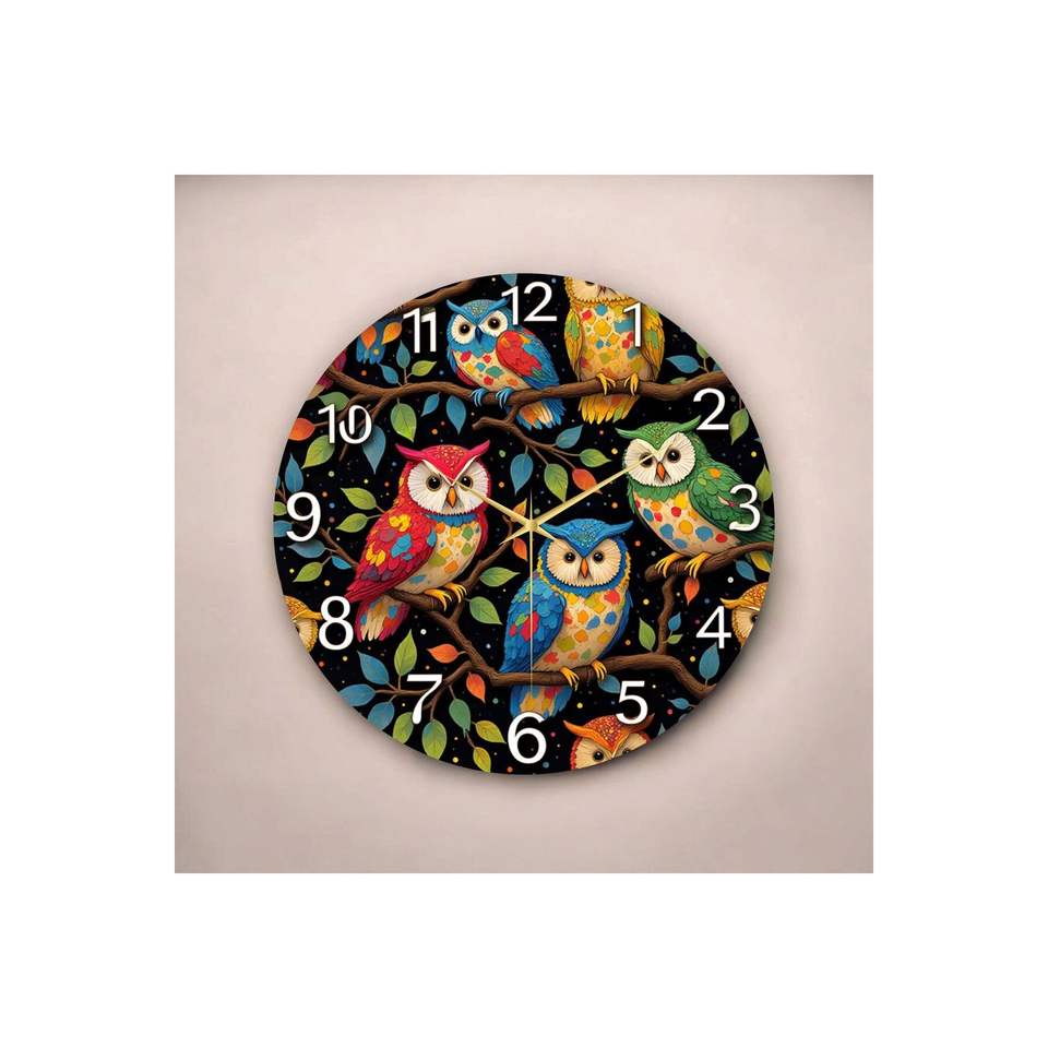 Reloj de pared redondo de madera silencioso con estampado de animales de búho colorido, 45x45cm, idea de regalo perfecta