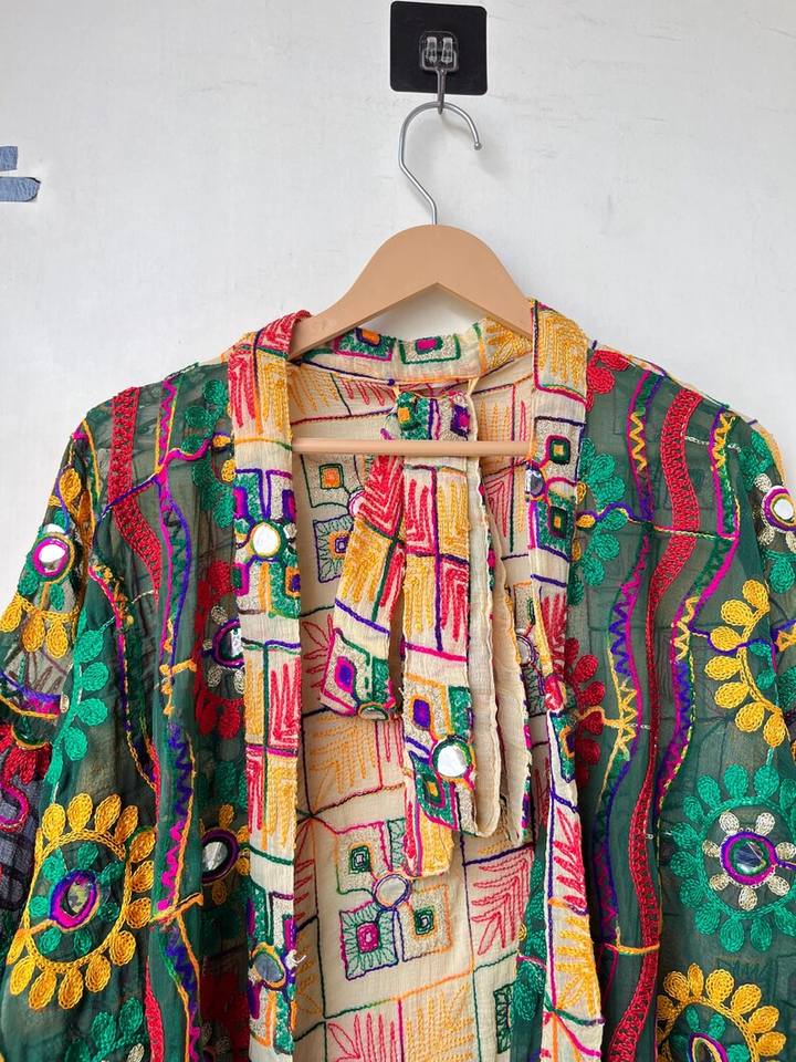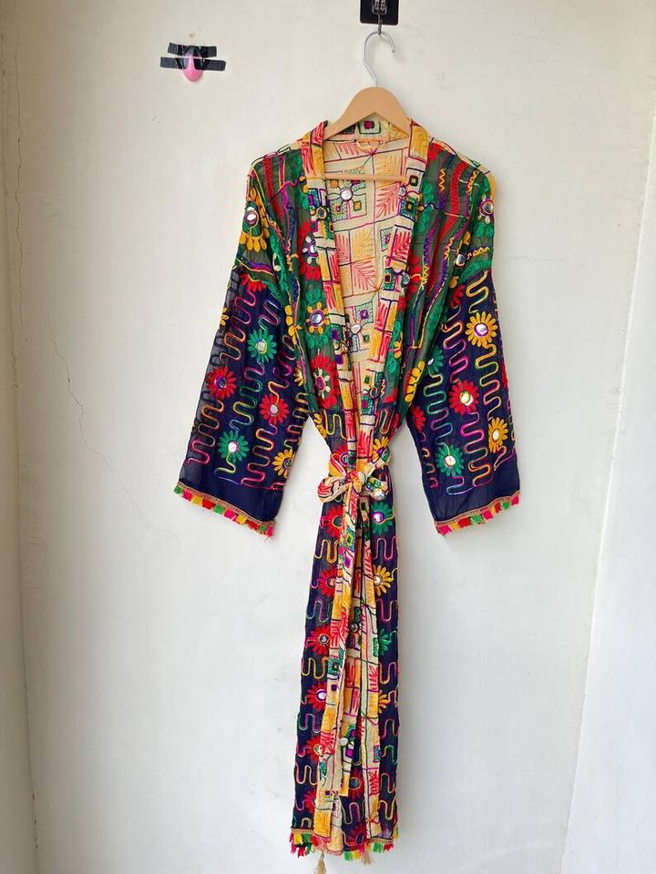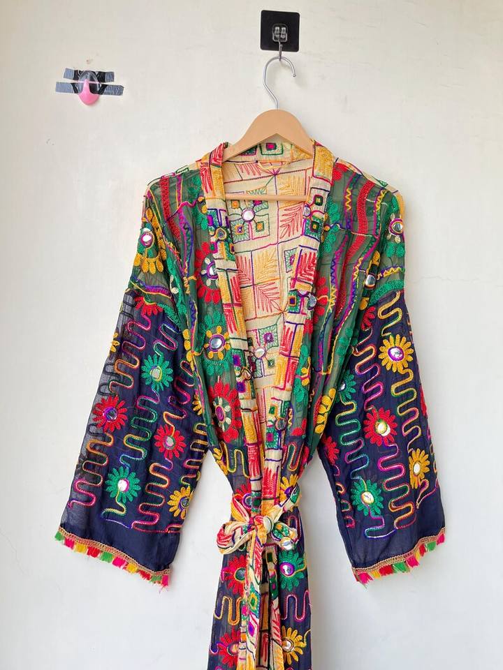Camisón Kimono de Verano, 100% Algodón, Suave y Transpirable, con Cuello en V, Cintura Elástica, Bordado a Mano con Espejos Estilo Phulkari, Colorido y Bohemio