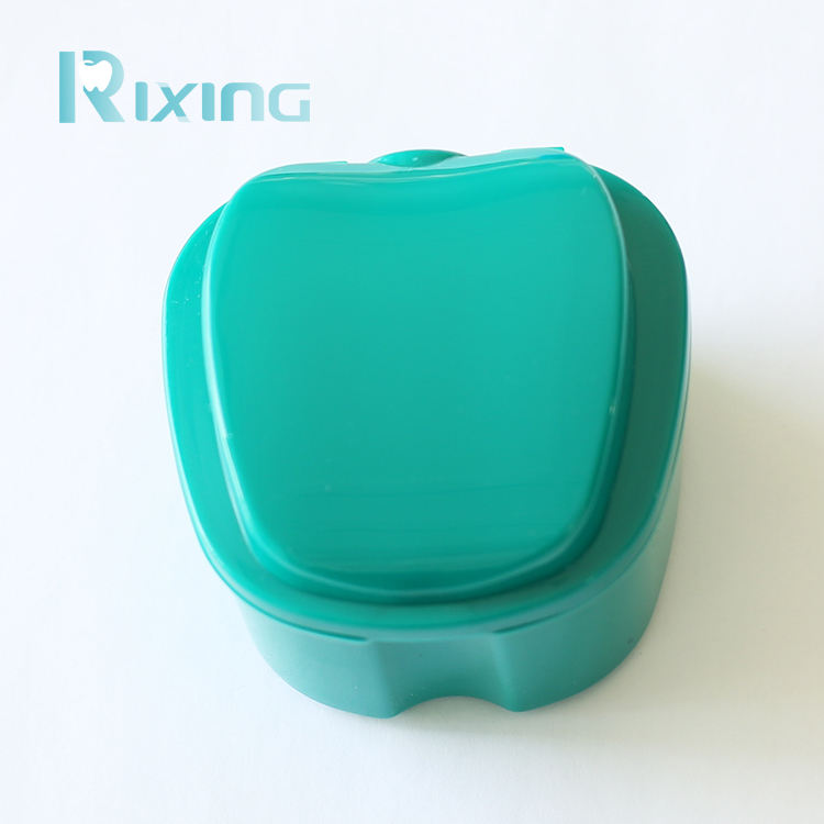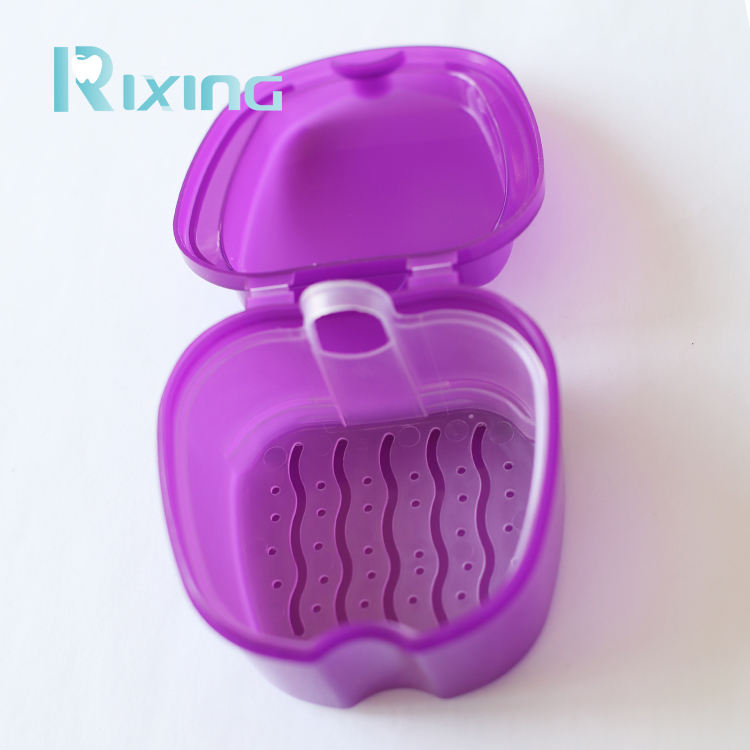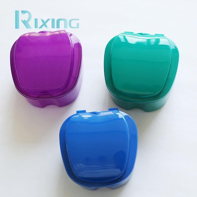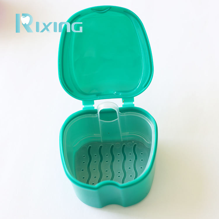 Caja de dientes falsos dentales de plástico colorido/caja de retención de dentadura/caja de soporte de dentadura con cesta