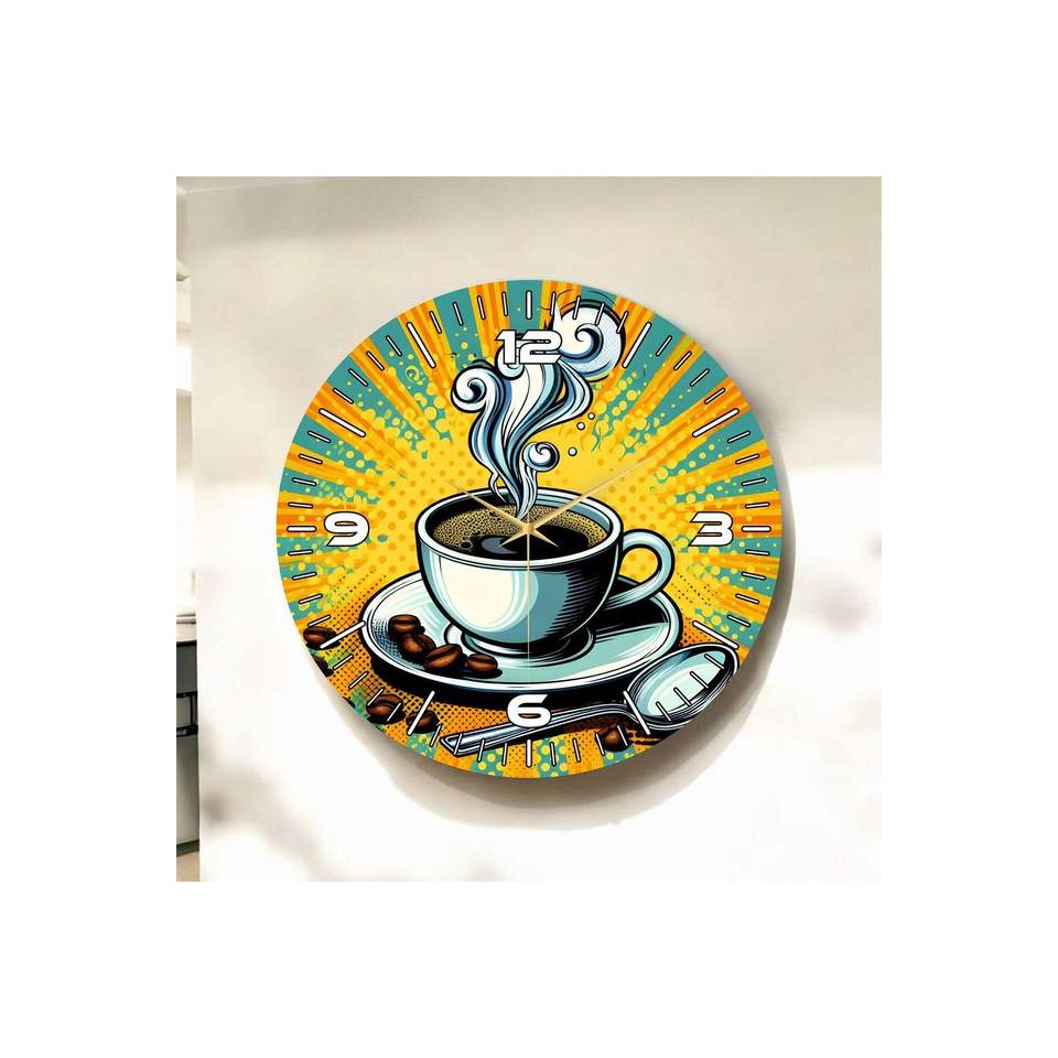 Reloj de pared de mesa silencioso de madera con patrón impreso colorido 50cm con taza de café-Idea de regalo
