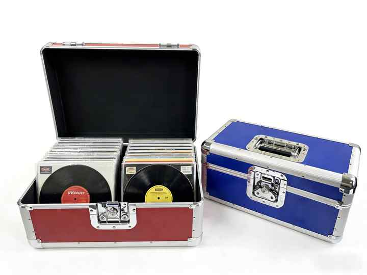 Estuche de utilidad colorido con un interior completamente forrado de espuma para contener aproximadamente 120 piezas de discos de vinilo de 7"