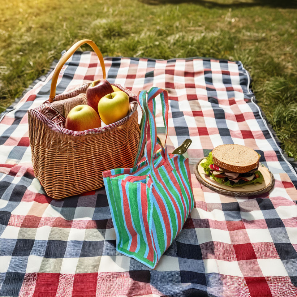 Bolsas de Compras Reutilizables Ecológicas de Plástico Tejido con Rayas y Cuadros Coloridos, Bolsas de Nailon Reciclado Tejidas a Mano