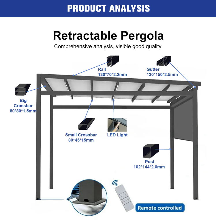 Pérgola Retráctil de PVC con Control Remoto de Aleación de Aluminio Comercial, Autoportante y Resistente al Viento para Azoteas de Hoteles, Bares y Salones