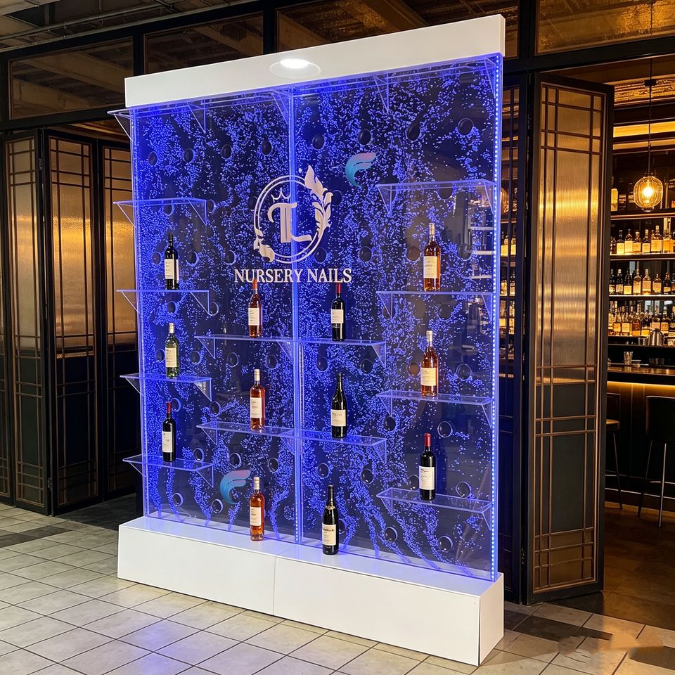 Fuente de agua comercial de acrílico transparente con LED y estante para vinos montado en la pared para decoración de bares, salones y restaurantes.