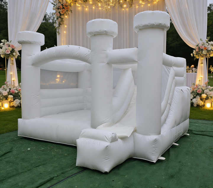 Castillo Inflable Blanco Comercial y Moderno con Tobogán, Casa de Brinco para Fiestas, Bodas y Eventos
