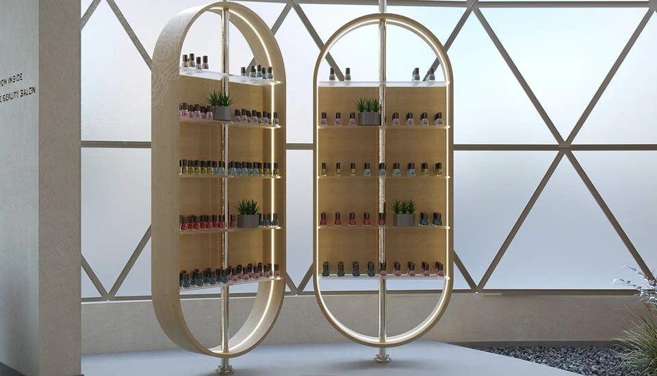 Mostrador de Recepción y Estante de Exhibición para Salón Comercial | Diseño de Interiores Integral para Salón de Belleza, Spa de Cabello y Uñas