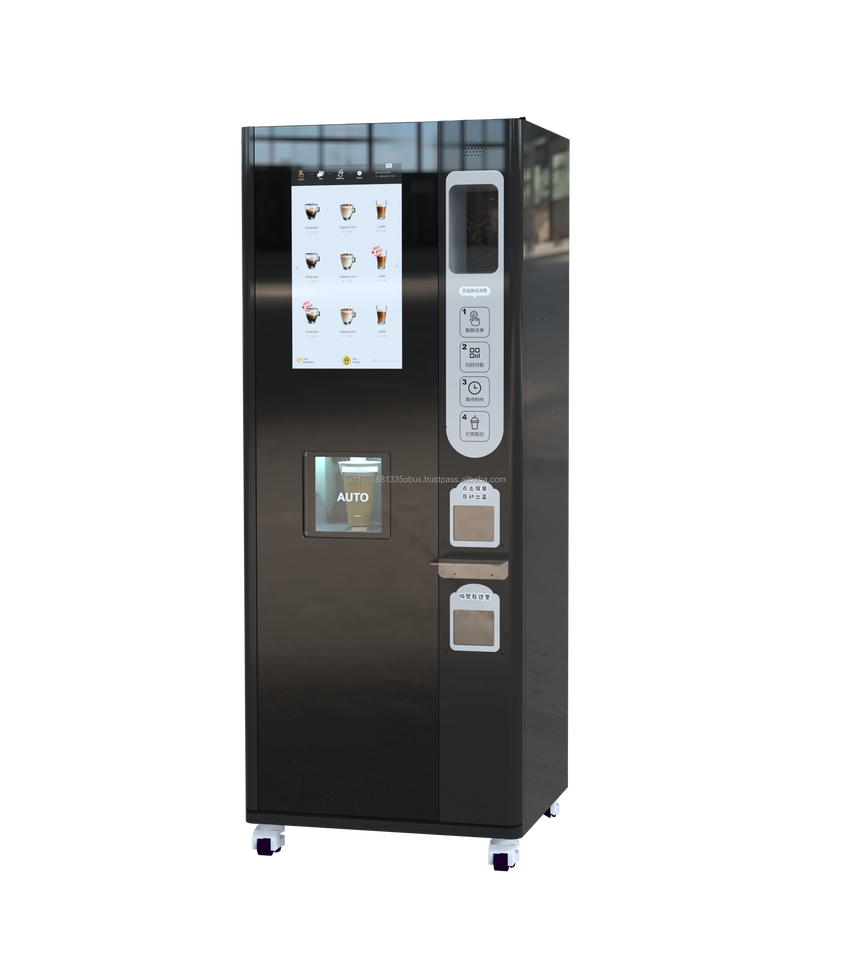 Máquina expendedora de café comercial de autoservicio con dispensador automático de tapas, dosificador de azúcar ajustable, pantalla táctil de 27 pulgadas y 80C