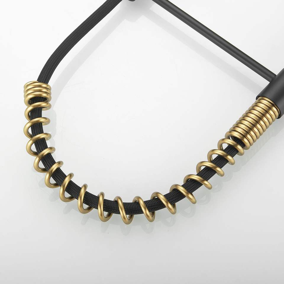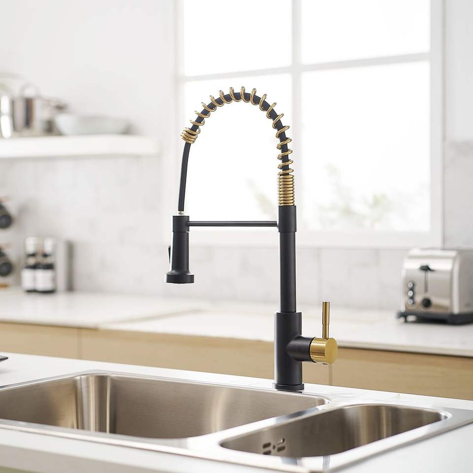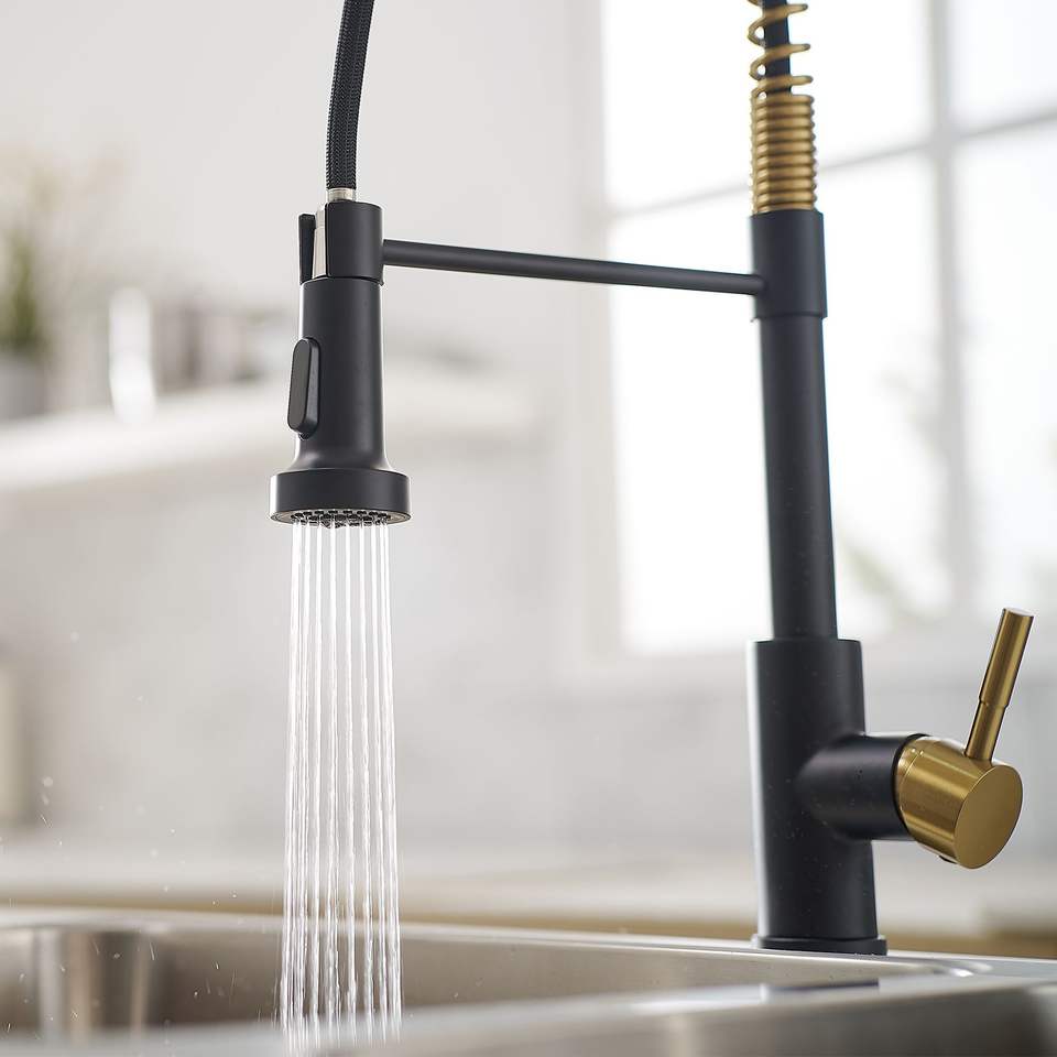 Grifo de cocina comercial monomando de una sola palanca, negro y níquel dorado, con rociador extraíble y función para fregadero