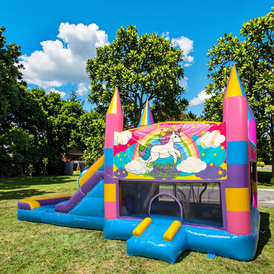 Castillo Inflable Comercial para Niños con Tobogán, Parque Infantil, Castillo Inflable con Tobogán y Piscina Combinados con Diseño de Unicornio Arcoíris
