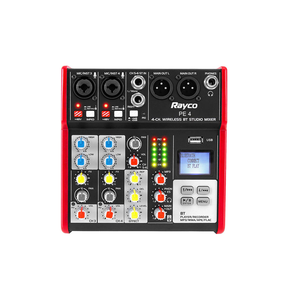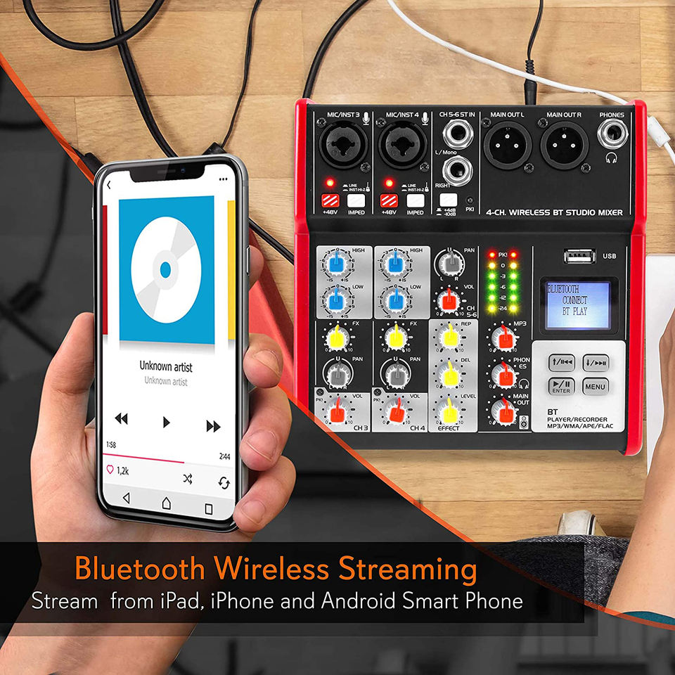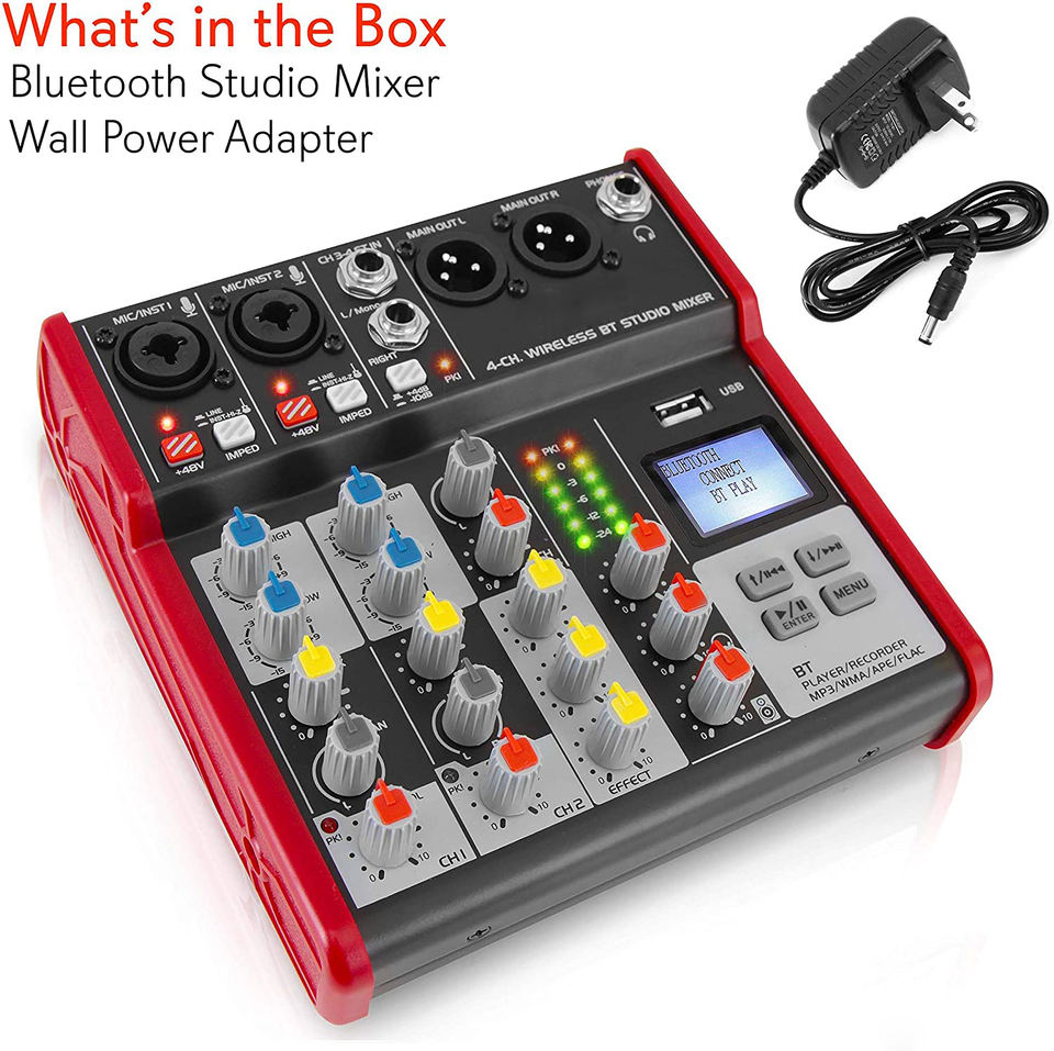 Tarjeta de sonido de grabación en vivo compacta de 4 canales Interfaz de audio Mezclador de consola de audio con ecualizador de 2 bandas y alimentación fantasma de 48V