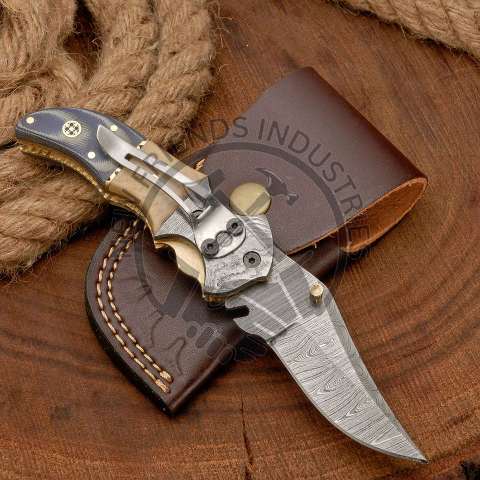 Cuchillo plegable compacto de acero damasco con Funda de cuero hecha a mano y agarre cómodo para acampar y uso diario