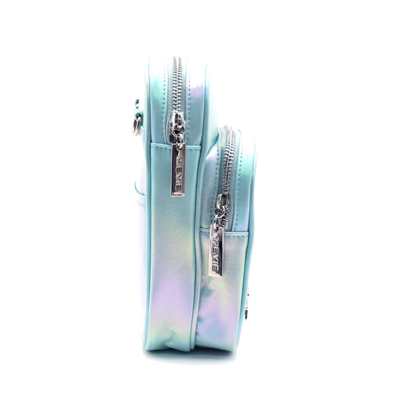 Bolso bandolera compacto para el día a día en color azul sirena con correa desmontable y anillo lateral para colgar objetos.