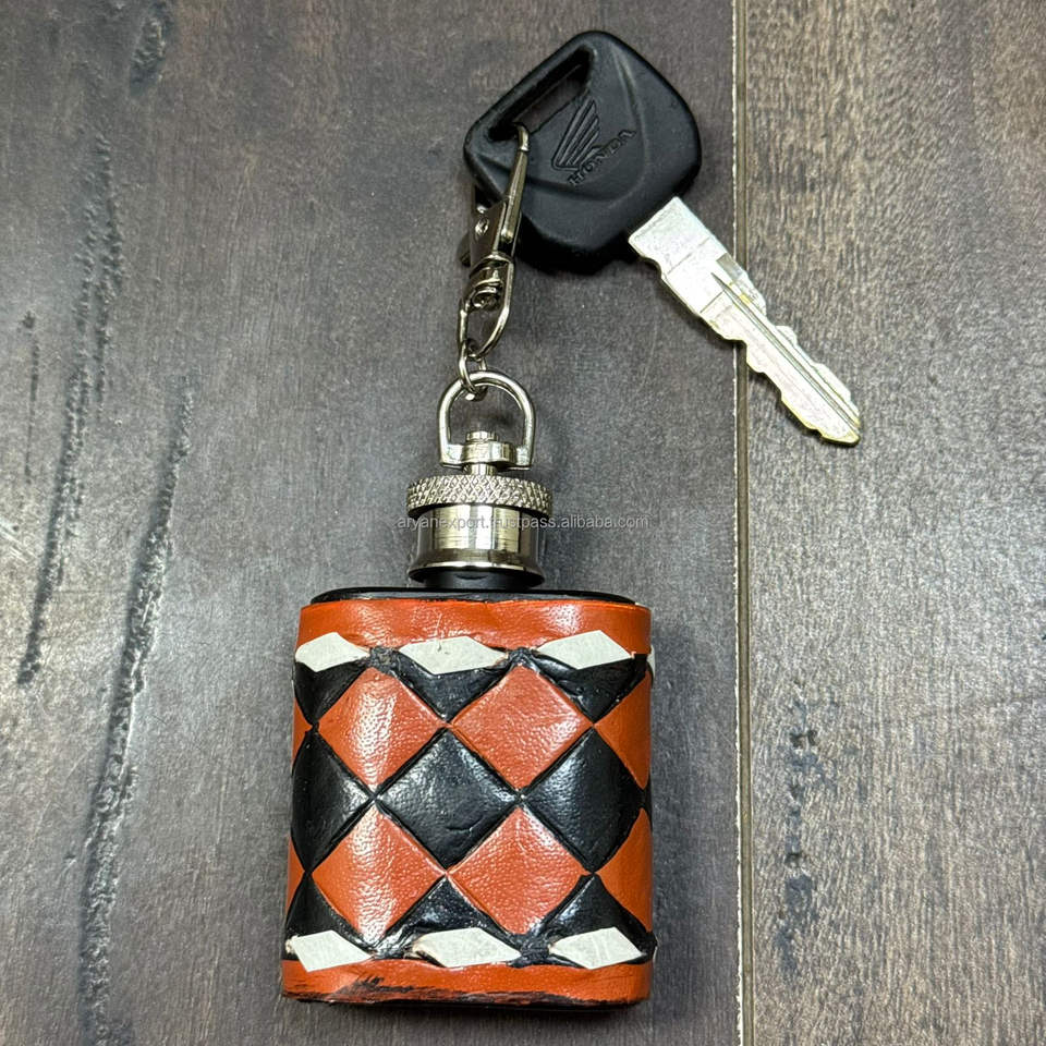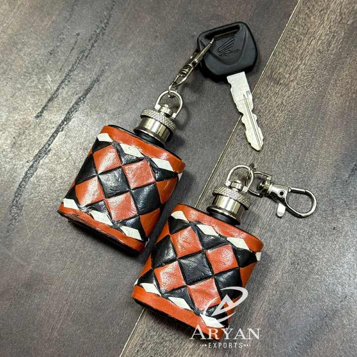 Petaca de acero inoxidable con cuero a cuadros repujado a mano y llavero