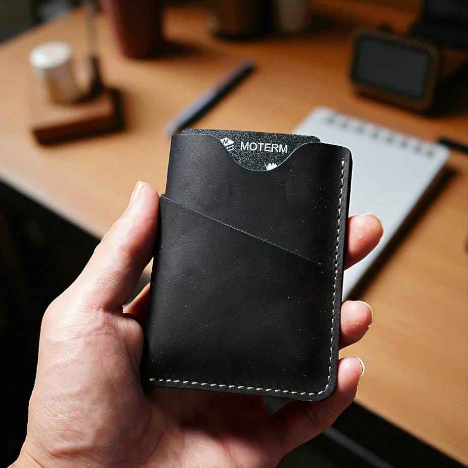 Tarjetero de cuero genuino hecho a mano compacto, billetera delgada con bordes bruñidos, organizador para uso comercial, HLC-0075