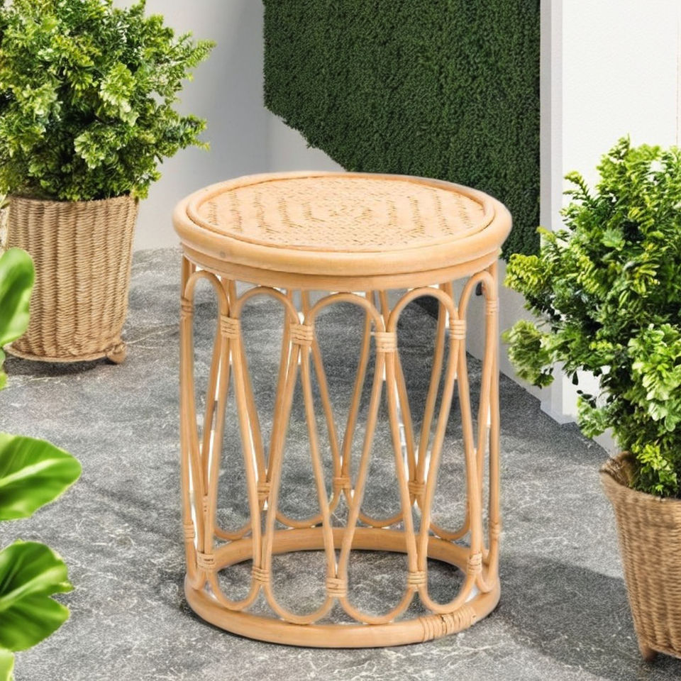 Mesa de ratán compacta con textura artesanal natural para entradas, esquinas, ajustes acogedores o uso en el parque