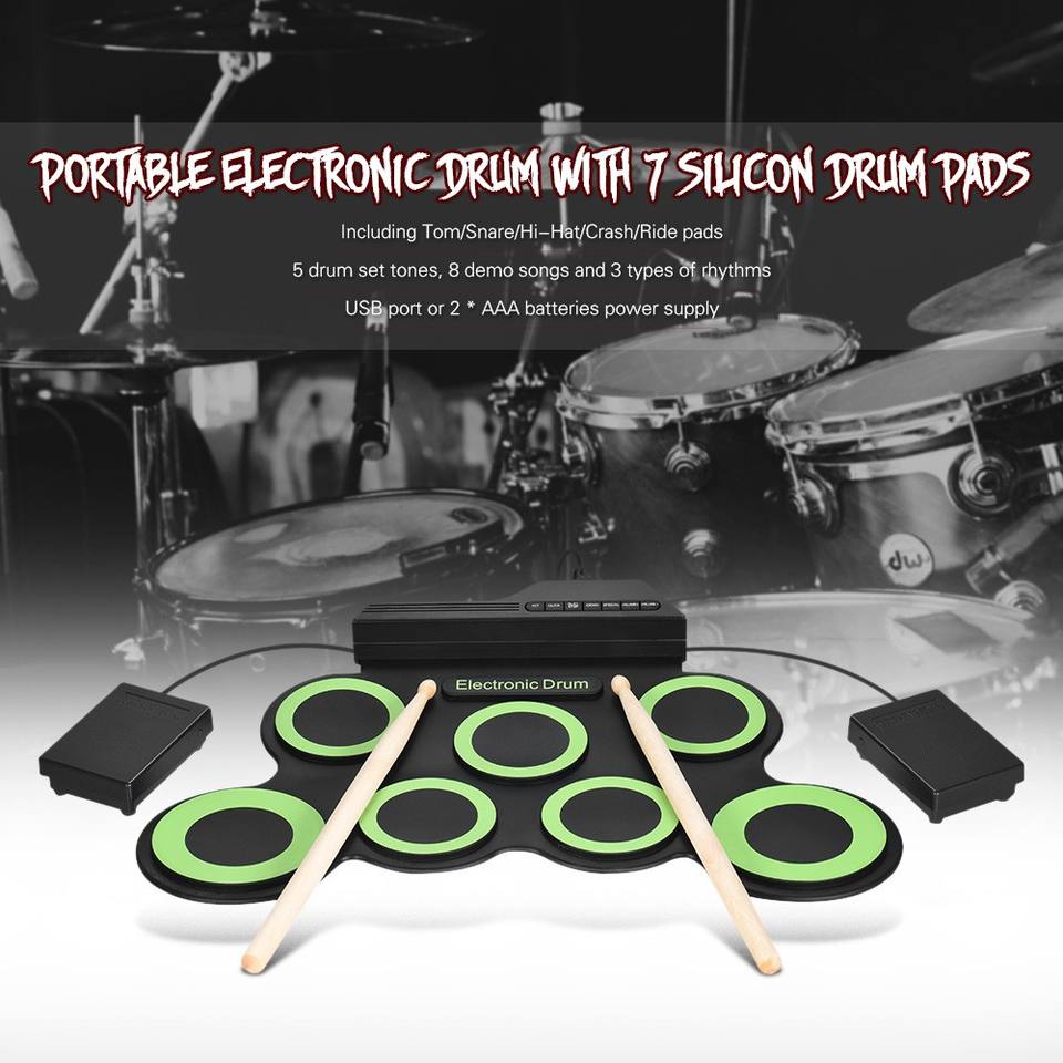 Kit de tambor enrollable electrónico Digital portátil de tamaño compacto, 7 almohadillas de tambor de silicona, tambor electrónico para niños principiantes de práctica