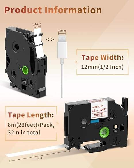 Cinta de Etiquetas Compatible con Brother TZE232 Roja sobre Blanca de 12 mm x 8 m