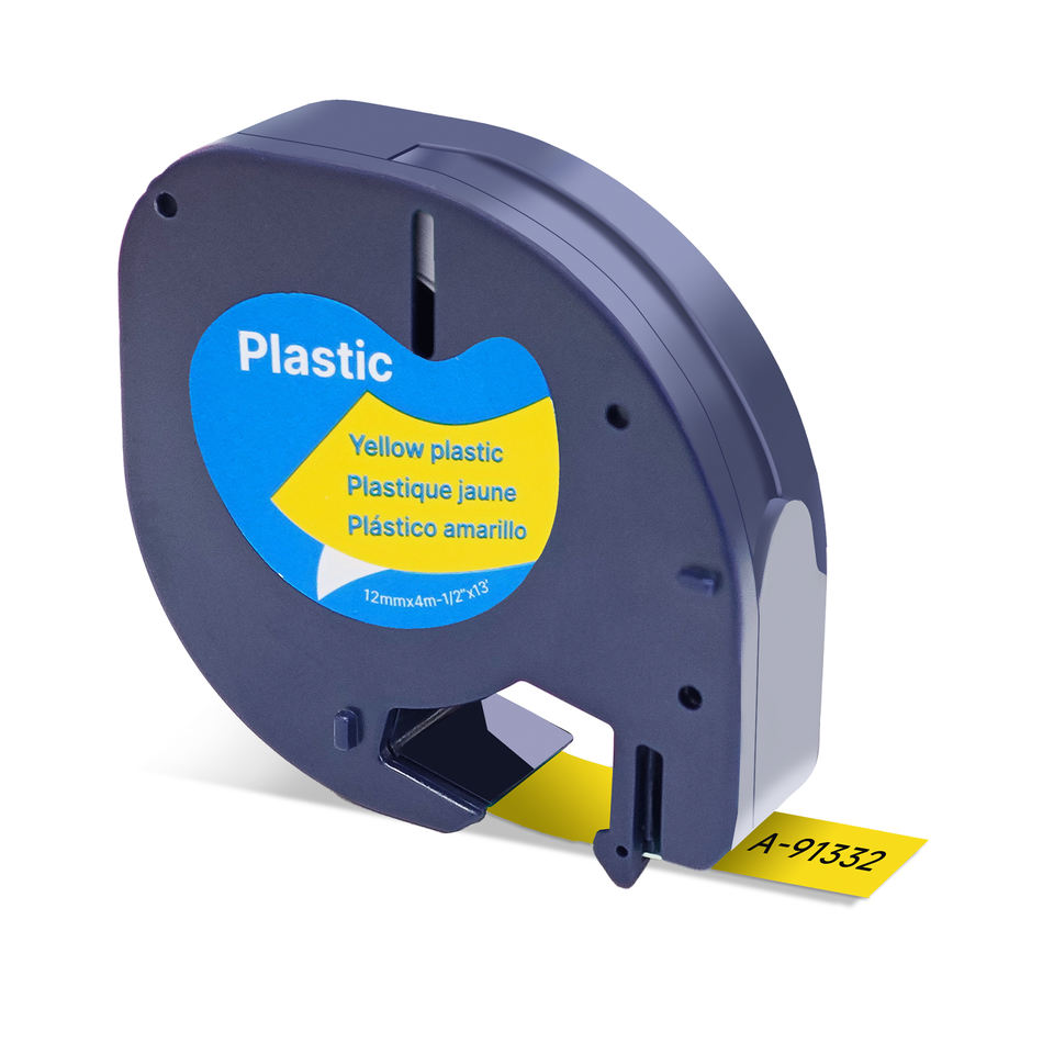 Cinta de Etiquetas Autoadhesiva de Plástico Negra sobre Amarillo de 12 mm Compatible con DYMO LetraTag LT 91332 91202 para Impresora 100H