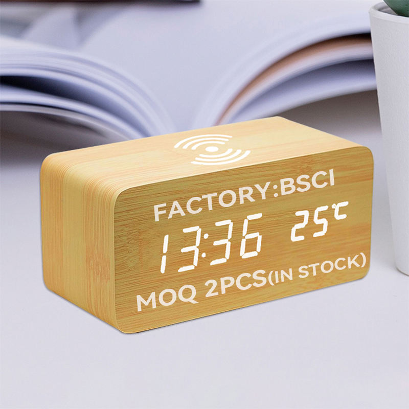 Precio competitivo, regalo promocional familiar, alarma, mesita de noche, grano inteligente, carga de abogado inalámbrica, mesa de regalo de madera, cargador de reloj de escritorio