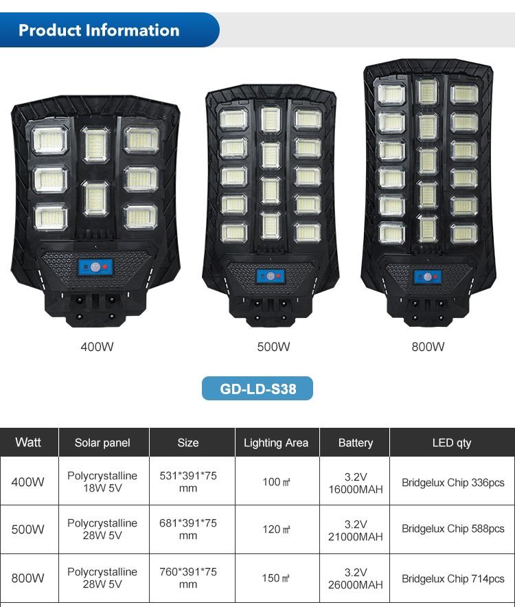 Precio competitivo Alto Lumen Impermeable Ip65 ABS 400W 500W 800W Farola solar LED integrada todo en uno