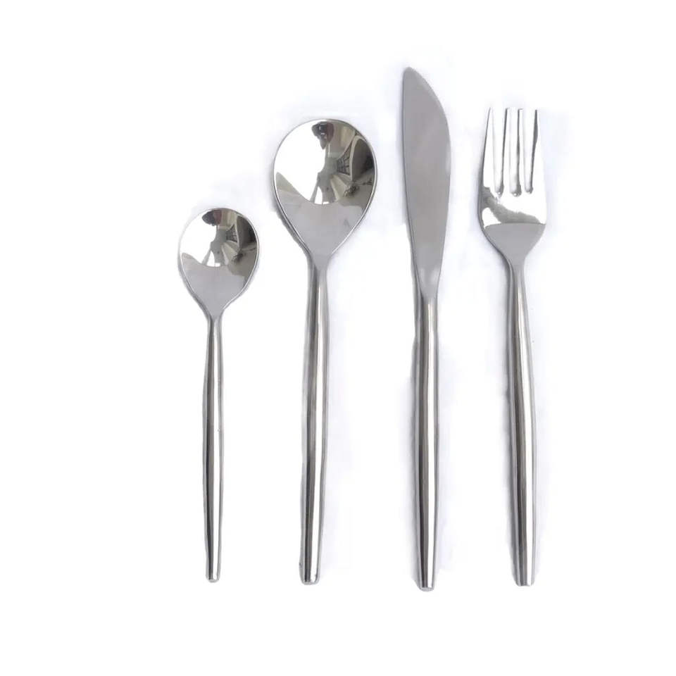 Juego completo de cubiertos metálicos con cuchara, tenedor y cuchillo diseñado para hoteles, restaurantes, servicios de catering y necesidades de comedor en el hogar.