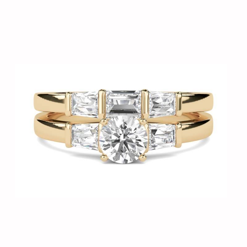 Juego completo de anillo con diamantes redondos en el hombro y banda a juego, diamante cultivado en laboratorio de 0.80 ct en oro blanco, amarillo, rosa y platino de 18 quilates.