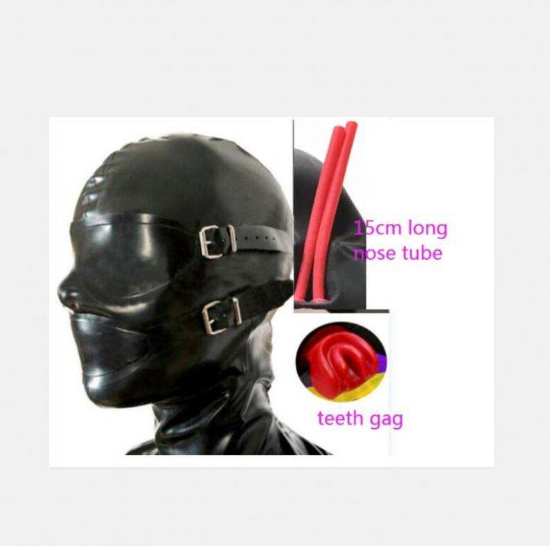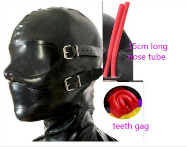 Látex de tipo completo con tubo de nariz largo Enchufe de diente Máscara de ojo extraíble y bozales Máscara de capucha con cremallera trasera Máscara sexy