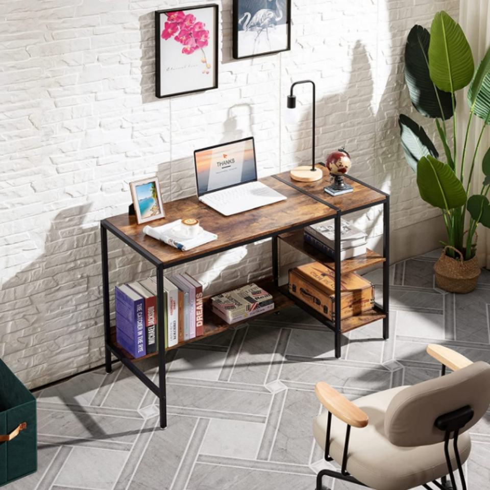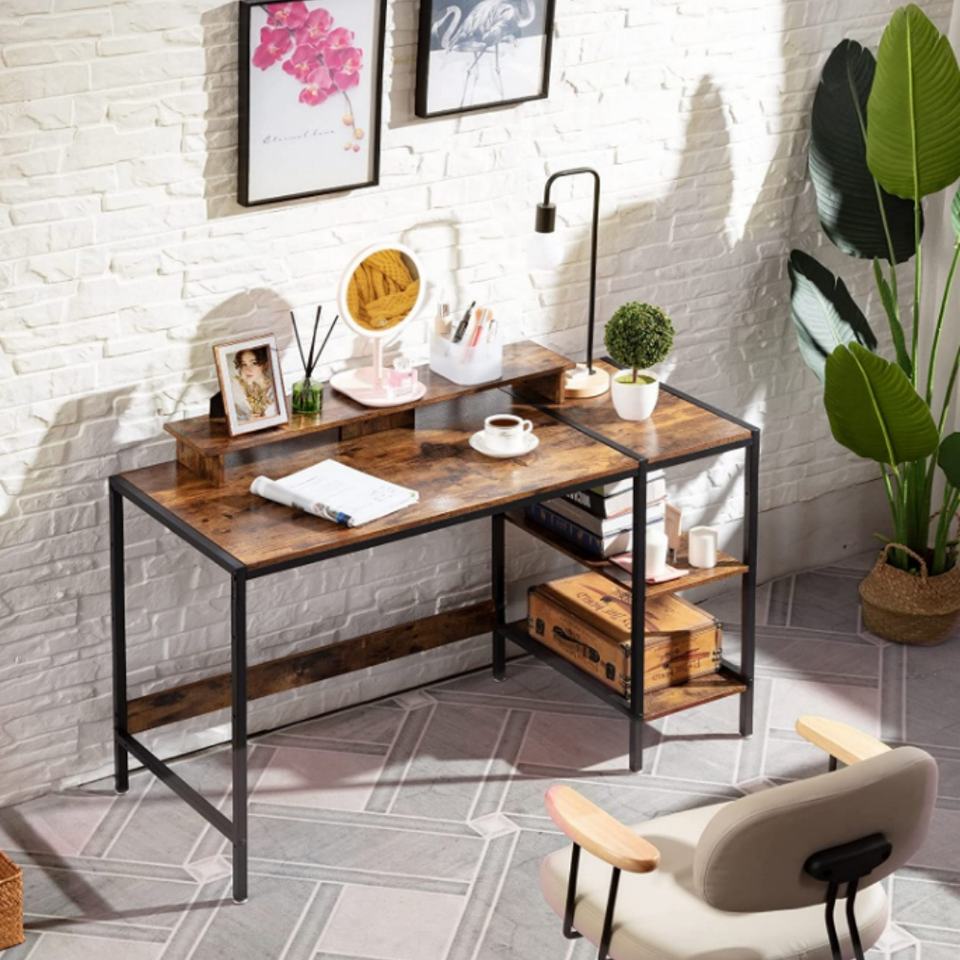 Escritorio de Computadora con Almacenamiento, Mesa Esquinera con Estante y Cajón, Mesa de Maquillaje de Madera y Metal para Oficina en Casa, para Escribir, Estudiar y Trabajar