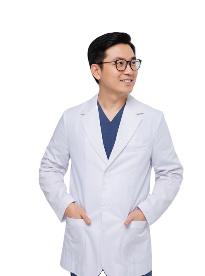 Profesional médico asiático seguro de sí mismo, con bata de laboratorio blanca abotonada y camiseta médica azul marino con cuello en V.