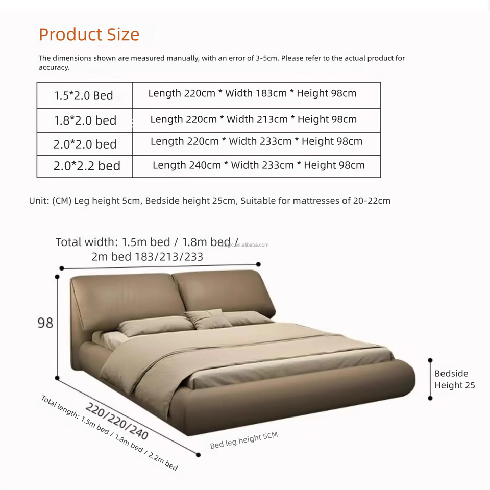 Material principal:Genunie cuero + esponja de alta densidad + patas de acero al carbono + listones de cama de pino