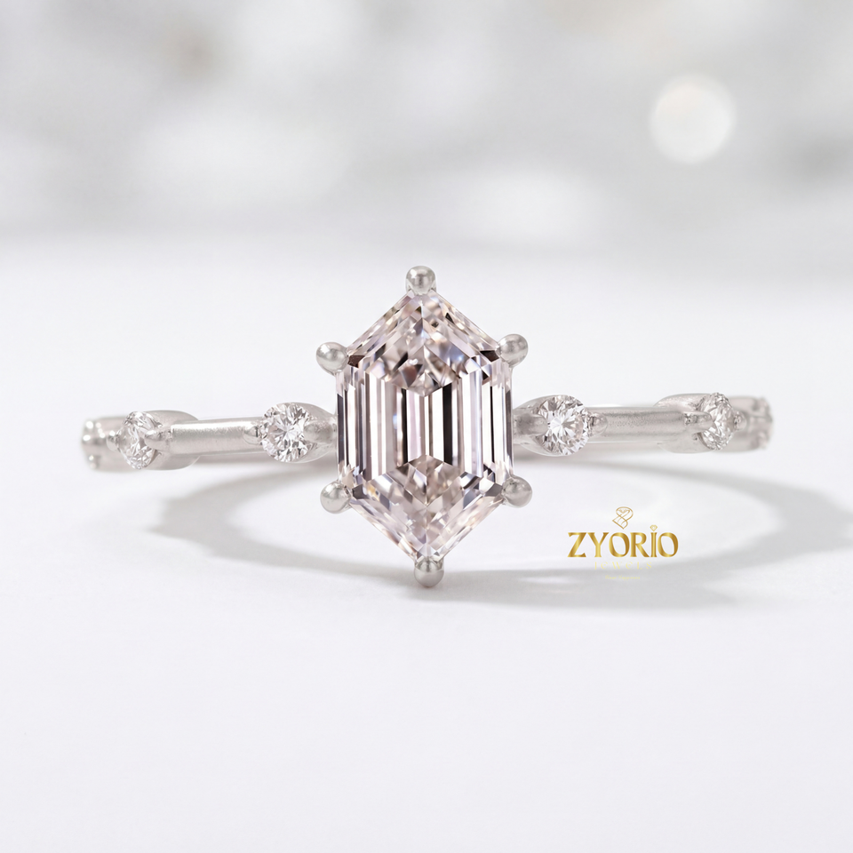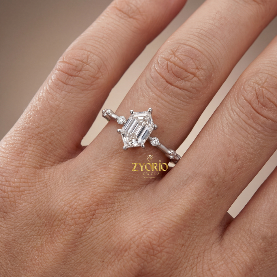 Anillo de compromiso y fiesta moderno con diamante hexagonal contemporáneo de corte escalonado cultivado en laboratorio, engaste de garra de plata 925, línea limpia y elegante