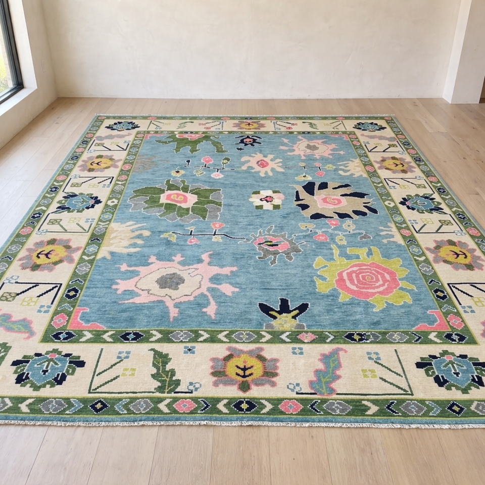Alfombra Tradicional Oushak Anudada a Mano, Azul Cielo y Verde, Geométrica, Multitamaño, Lana/Seda, Antideslizante, Hecha a Mano, para Corredor, Oración, Picnic
