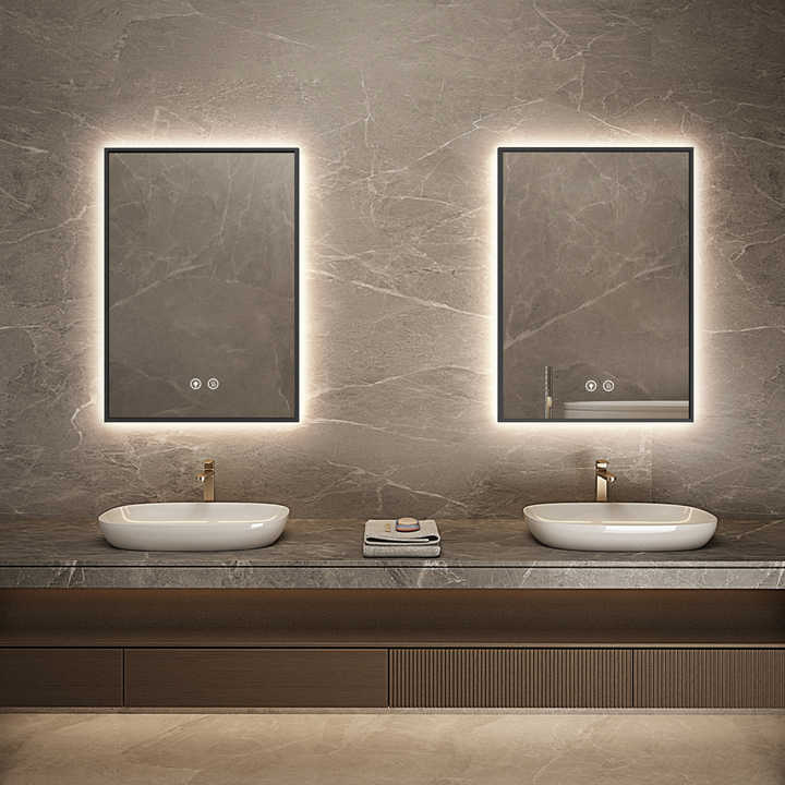 Espejo de baño LED rectangular contemporáneo con marco negro y espejo de temperatura de 3 colores