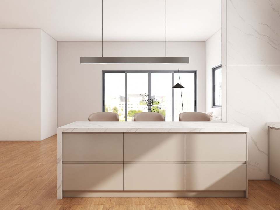 Conjunto de Muebles de Cocina Contemporáneos y Elegantes con Encimera de Mármol, Funcionales y Modernos con Detalles en Madera e Isla, Cocina Moderna