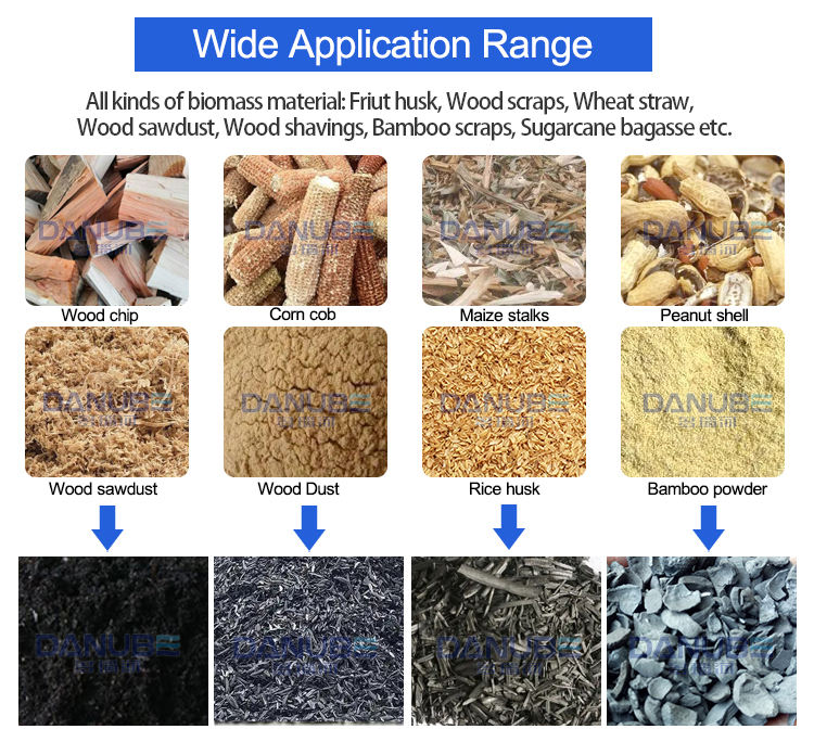 Materias primas aplicables:Bicarbonato de aserrín de madera Cáscara de Palma de bambú Cáscara de nuez Cáscara de arroz