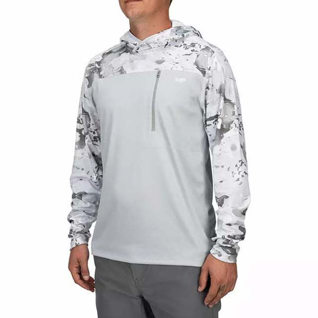 Contraste de color Nueva moda Diseño de camuflaje Sublimación Rendimiento de manga larga Protección solar Transpirable Pesca Camisas con capucha