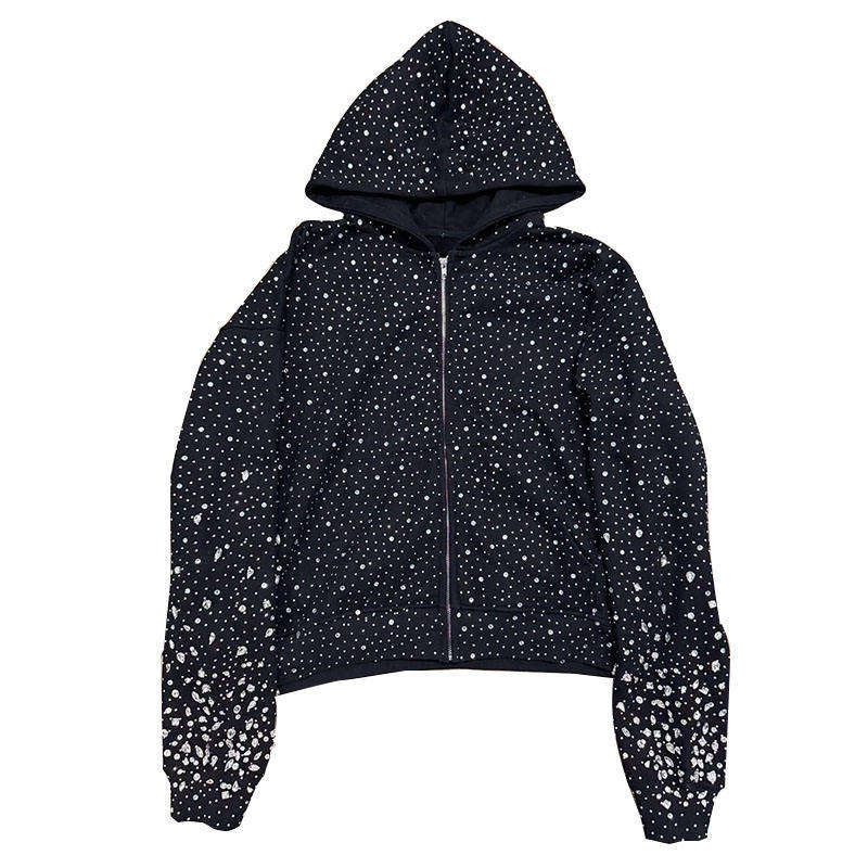 Sudadera con capucha para hombre con cremallera de contraste y pedrería, mezcla de algodón y poliéster, detalles de cristal con dientes metálicos, estilo urbano
