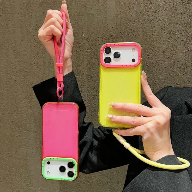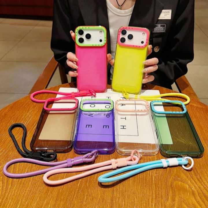 Funda para teléfono con marco de cámara en colores contrastantes, transparente, en colores dulces, con correa y cubierta trasera para iPhone XR XS Max 11 17 Pro Max