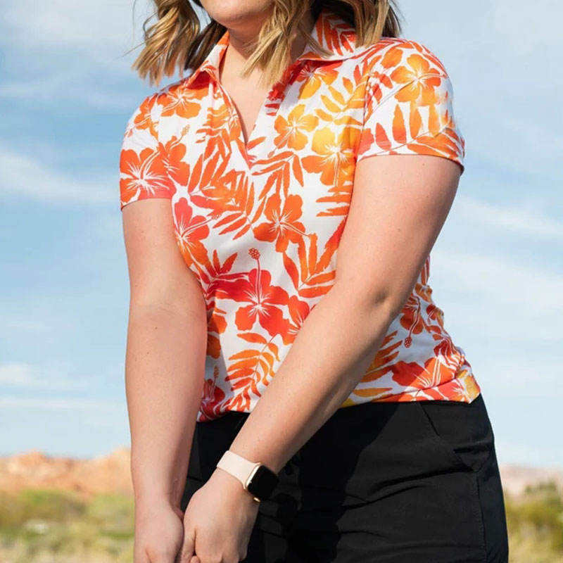 Polo de Golf para Mujer con Estampado Floral Personalizado, Manga Corta, Elástico en 4 Direcciones, Sensación Fresca, Poliéster y Spandex